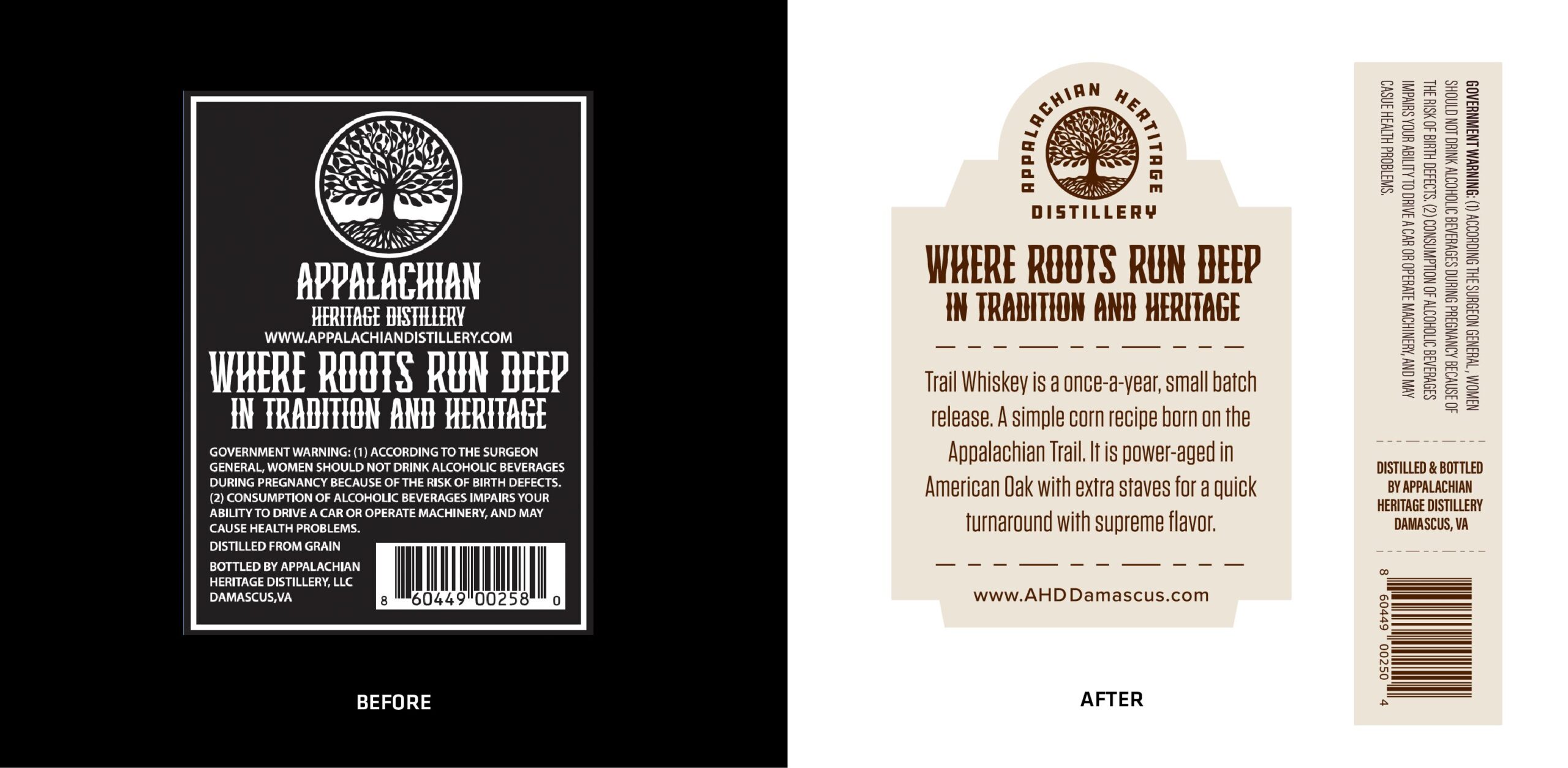 Located directly on the Appalachian Trail in downtown Damascus, VA Appalachian Heritage Distillery proudly produces pristine spirits. Each year the town hosts the world’s largest celebration of the Appalachian Trail and hiker culture. AHD wanted to commemorate this event with a special batch of whiskey and a new label design that distills the spirit of these AT trekkers.